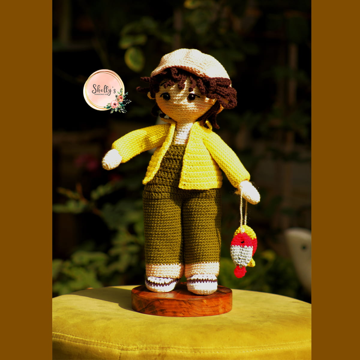 Ivaan, the Fisher-Boy is crocheted with the softest yarn and is washable. He is wearing a tee shirt and shorts but before meeting you, he puts on a pair of dungarees, a cap, a jacket, and his boots. Oh! forgot to mention he picks up a couple of fish too :)